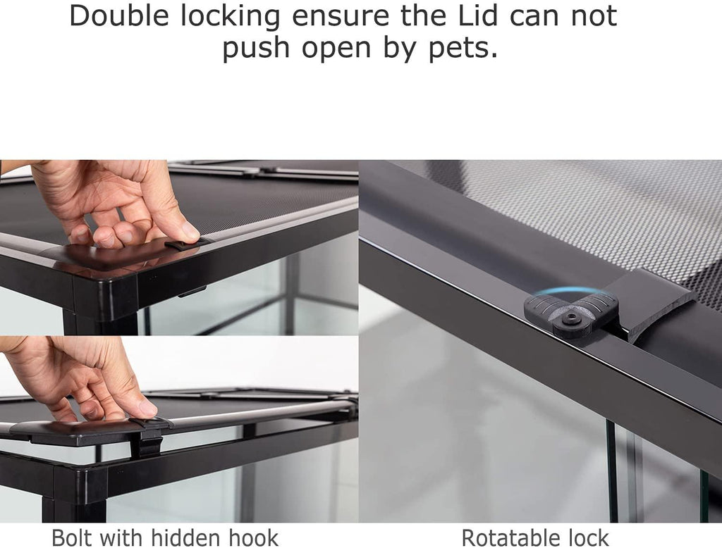 - 【WATERPROOF RAISED BOTTOM】Raised bottom plate provides adequate ventilation and enough spaces for accessories such as UTH(under tank heater). And waterproof bottom provides a comfortable living environment for amphibians.