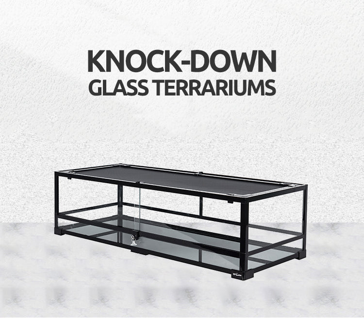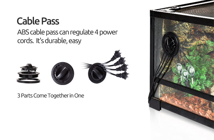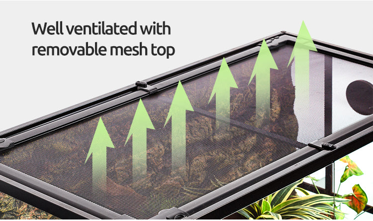 - Removable mesh cover with wire slot: The full-screen top allows UVB and infrared penetration, and is completely removable for easy access while decorating or cleaning. Durable locks secure the screen top to the terrarium frame. The top has built-in closable inlets on both sides to securely run wires and tubing inside the terrarium and keeps small reptiles and feeder insects inside the terrarium. There is also a flexible side vent that can be positioned as required. The side meshes and side glasses can be switched.