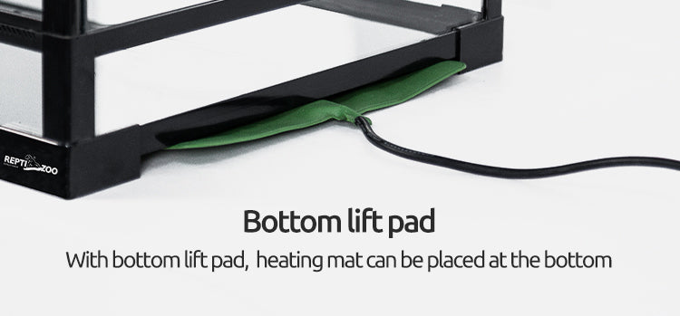 - Raised bottom: The bottom glass panel of the terrarium is raised to facilitate the mounting of a substrate heater or heat cable, and prevents heating accessory problems normally associated with standard “aquarium style” terrariums. It keeps the entire bottom panel well ventilated to ensure optimal hot and cold spots.