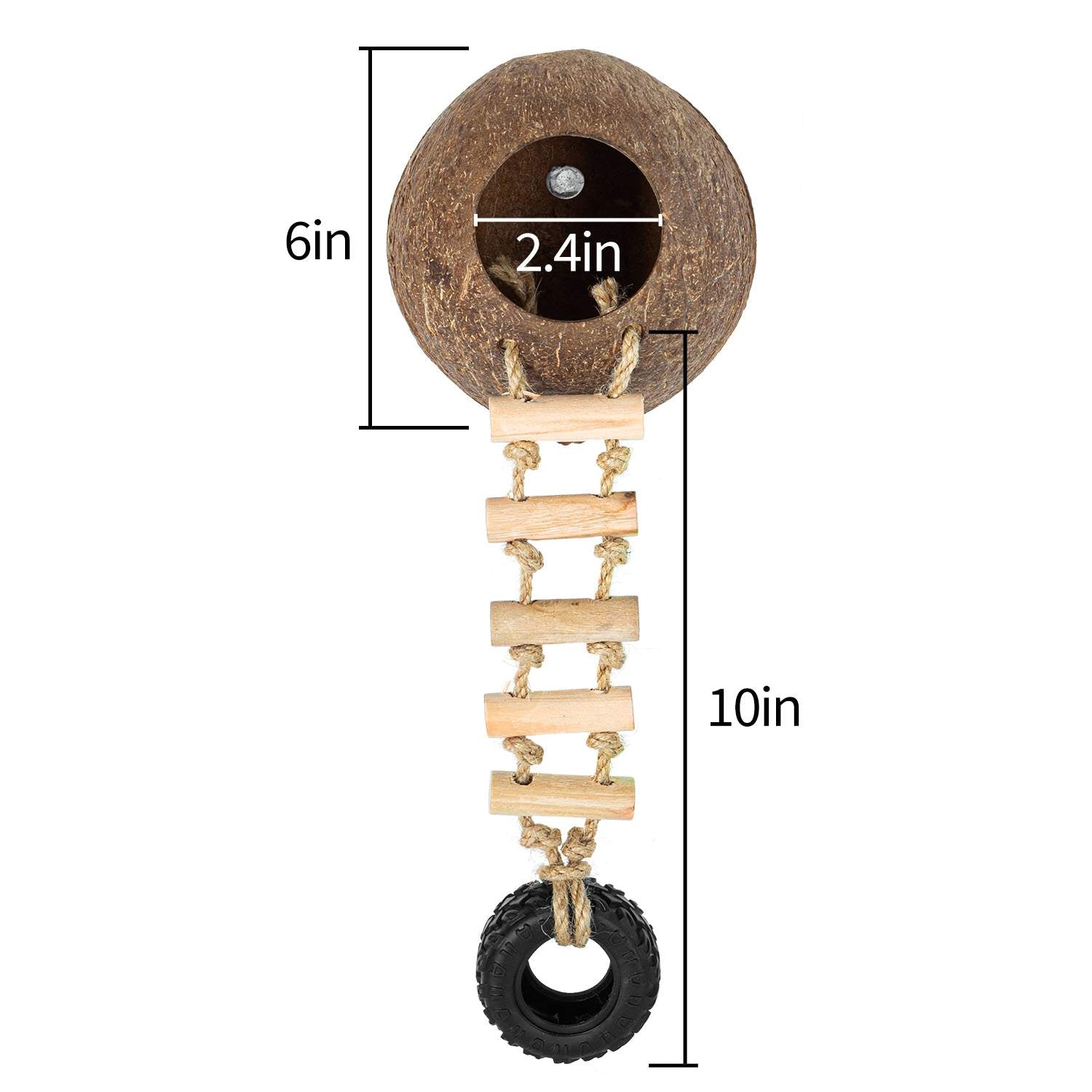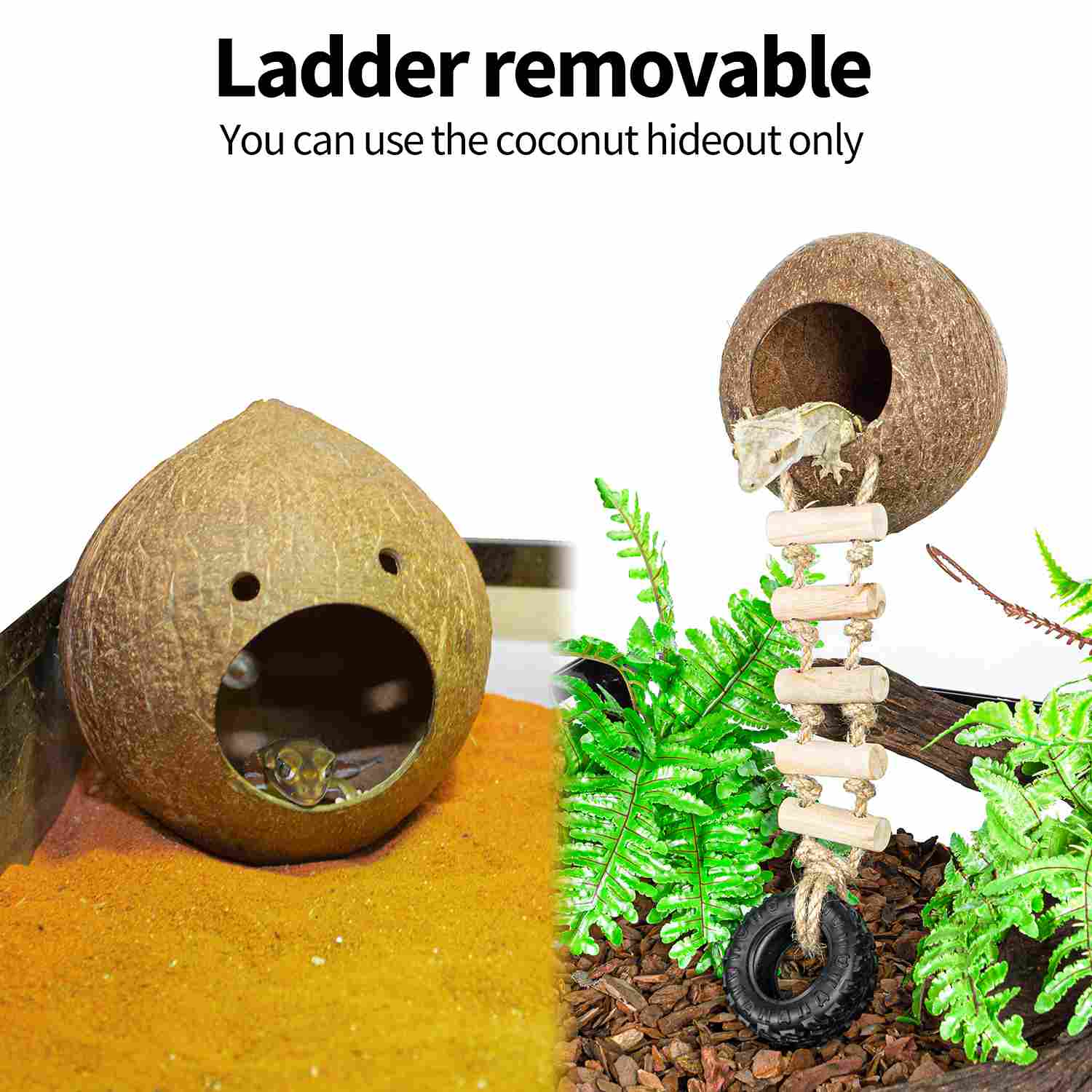 - Widely Used: Size: This coconut shell hideout with a ladder is perfect for pets that like to climb or hide, such as Crested Gecko,Hermit Crab, Lizard, Leopard Gecko, Hamster, Rat etc. It can also be used as birdhouse.