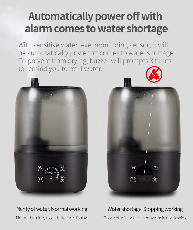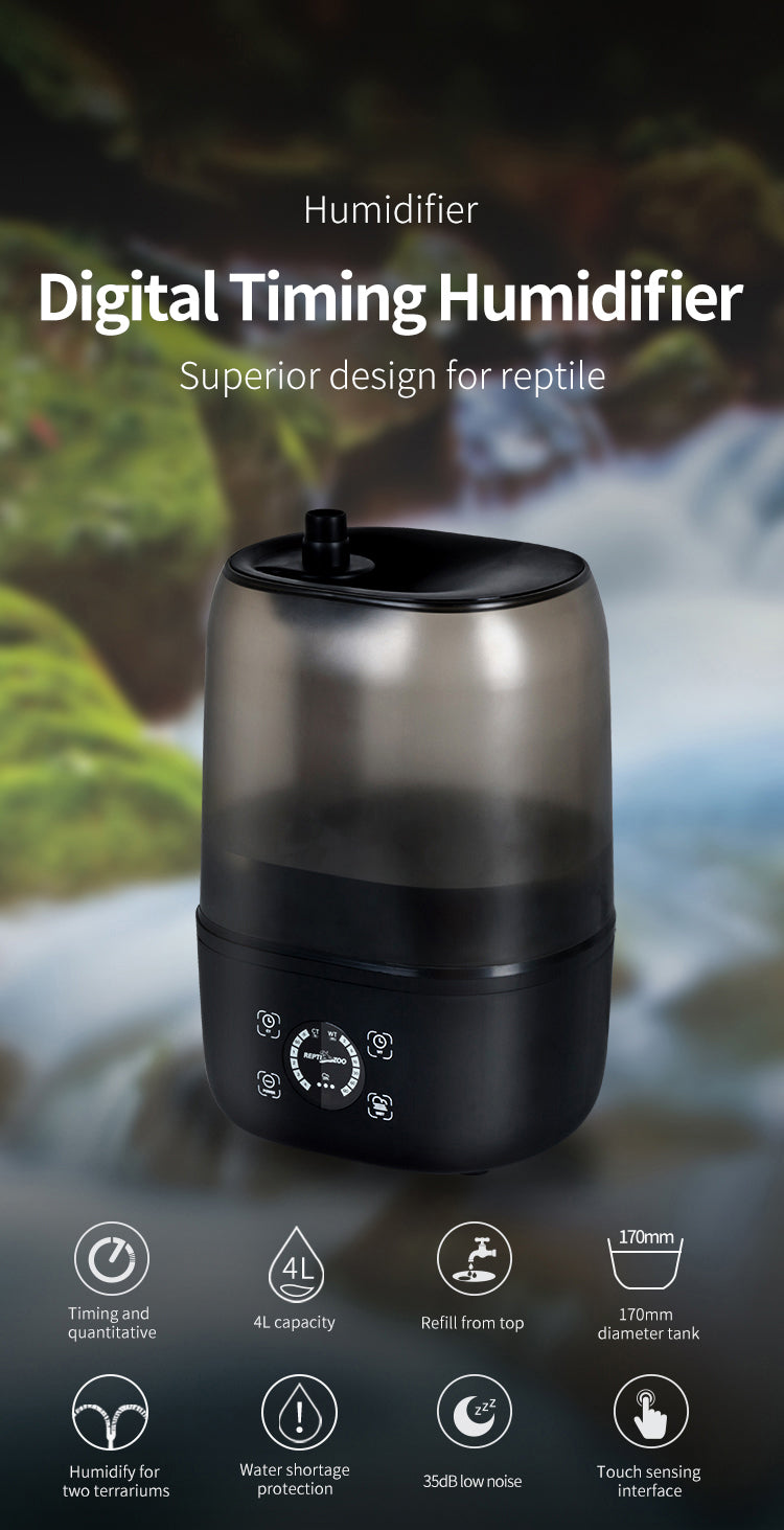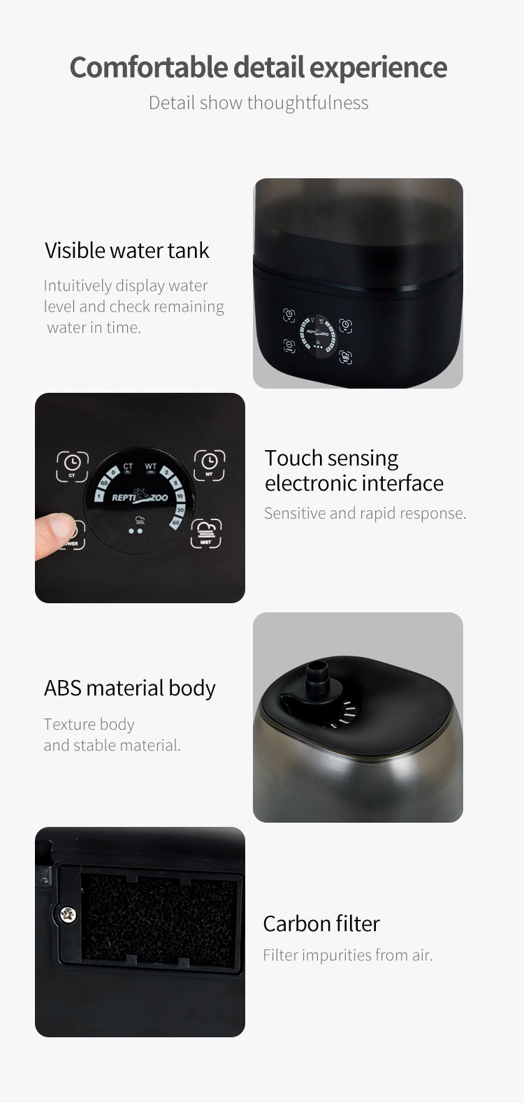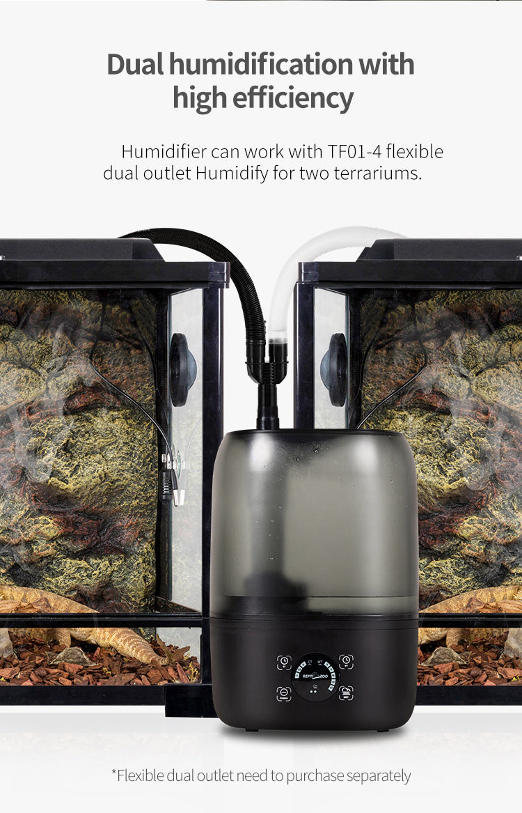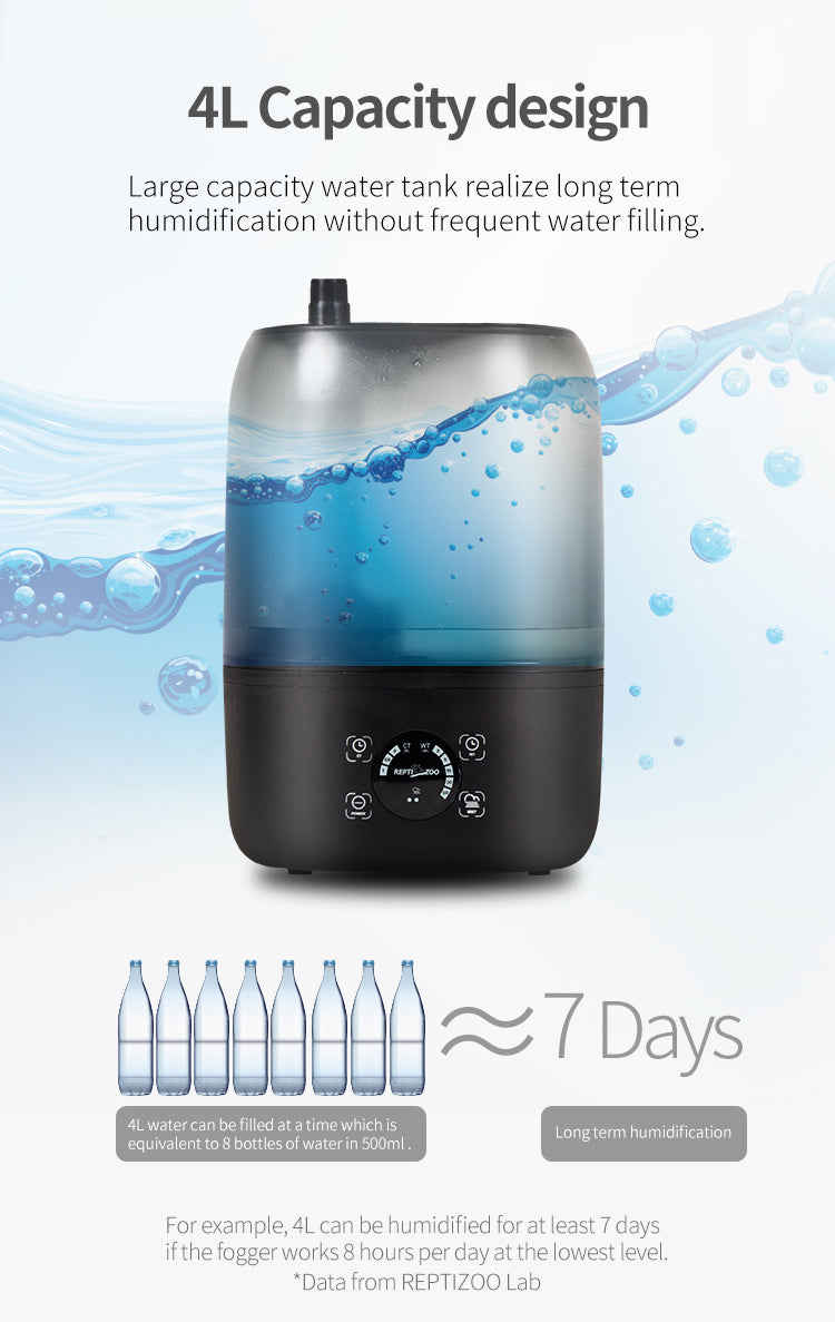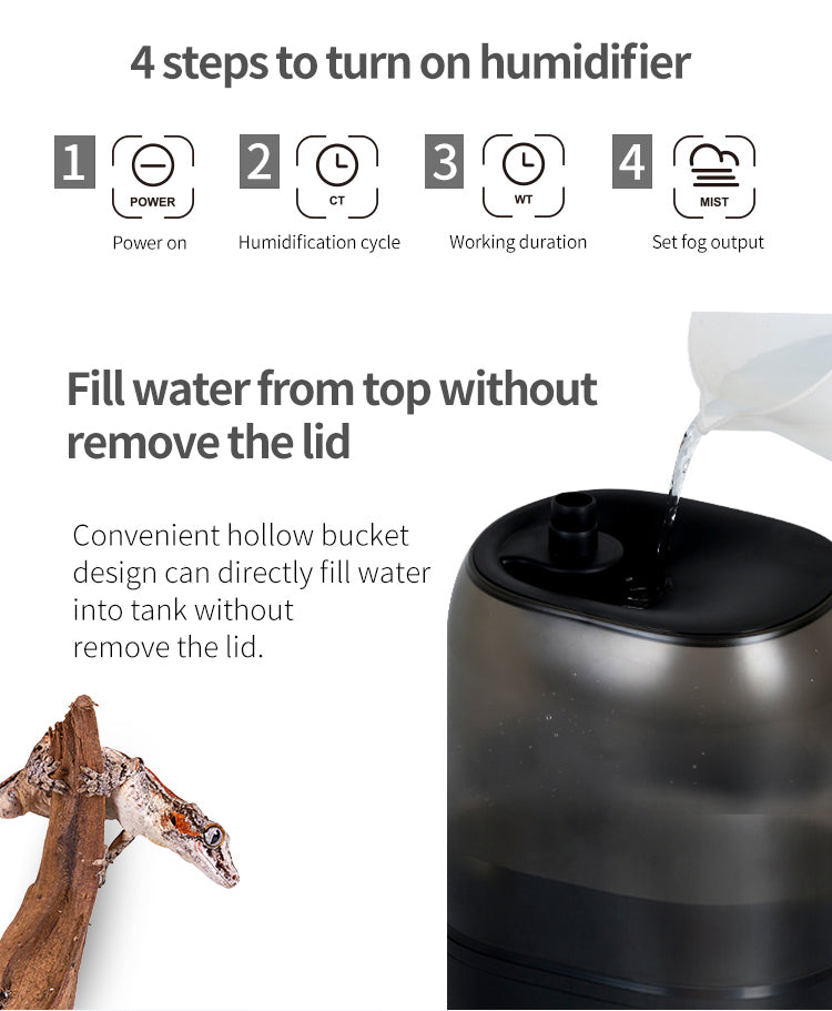- 4L Large Capacity & Easy Filling: The Capacity of our Reptile Humidifier tank holds up to 4 liters (1.06gallon)of water, the fogger humidifier allows up to 12 hours of working time in max mist(300ml/per hour), no need to add water frequently, long-term fogging and moisturizing; you can add water directly from the top opening without removing the water bucket by the upgraded integrity design, which also ensures the water does not leak from the tank.