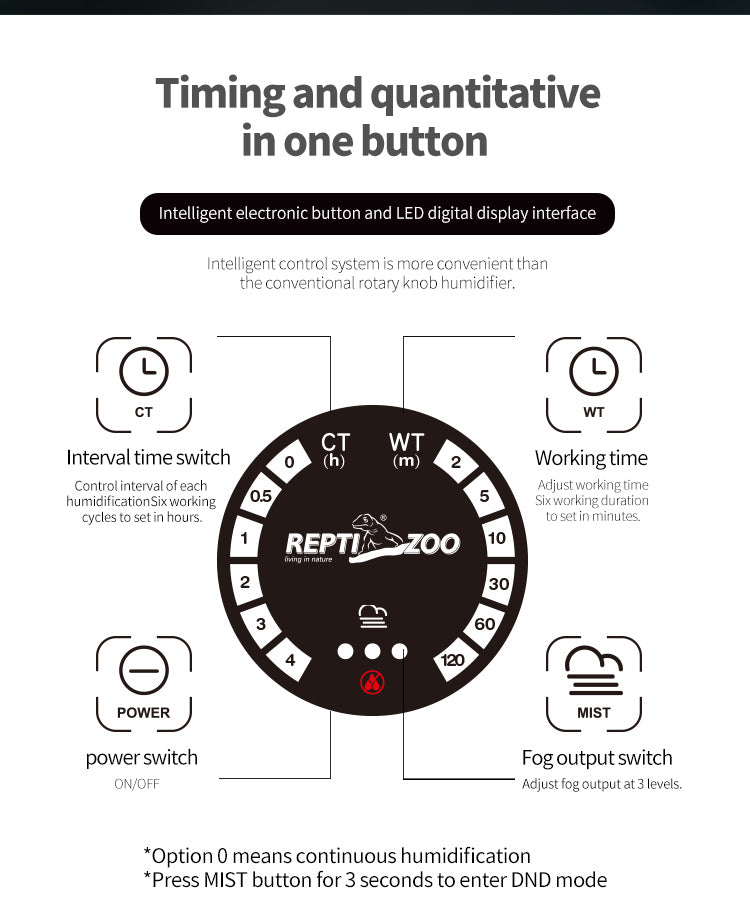 - Smart Touch Screen & Memory Function: This reptile fogger uses the intermittent timing principle to set the spraying frequency, interval time, and spray duration for repeated periodic humidification. It can start or stop working automatically with a separate humidity controller (Not Included) for constant humidity. With memory function, no need set it every time, this reptile humidifier can continue to work according to the last setting.