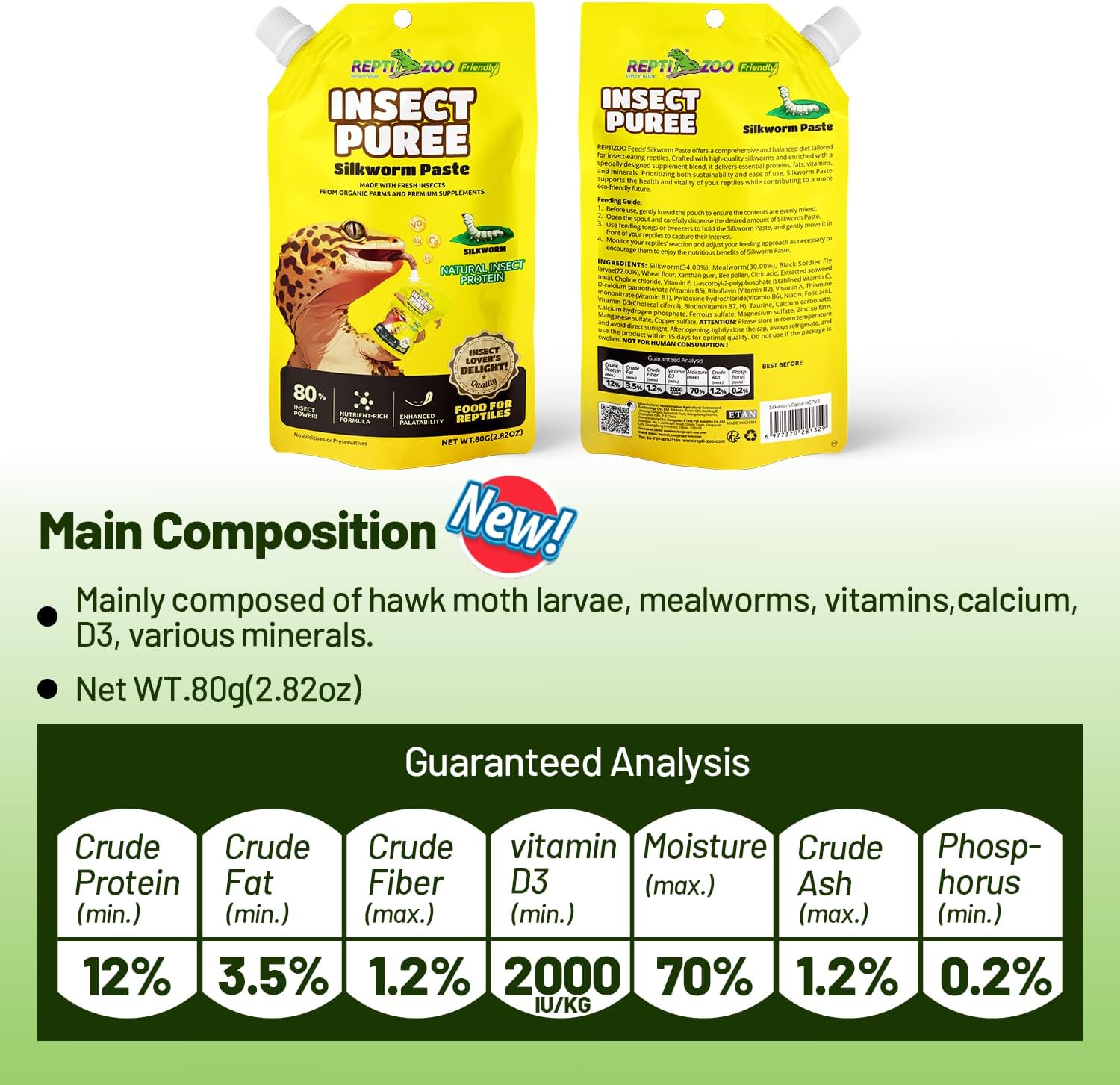 | Ingredient Composition | Silkworm, Mealworms, Vitamins, Calcium, D3, Minerals |