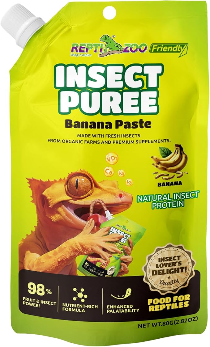 Treat your scaly friend to a delicious blend of farm-raised insects and sweet banana puree. This nutrient-packed formula supports bone health and overall vitality with a balanced mix of calcium, vitamins, and minerals. Simply squeeze the convenient, mess-free pouch directly into a feeding bowl for an instant, appetizing meal your reptile will adore. It is the perfect way to add variety and excitement to your pet's daily diet.